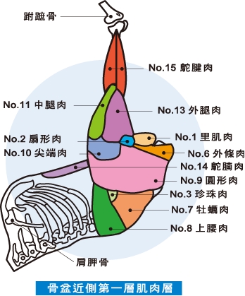 一塊重約0.5公斤,為相當長的肌肉,屬於背部連接腿部肌肉,位於扇形肉、里肌肉及內條肉之間,相連於骨盆骨及小腿內側膜間