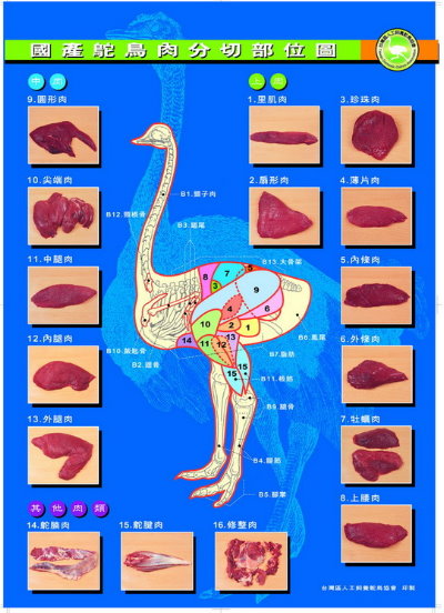 台灣鴕鳥肉的分為菲力、沙朗、鴕腩肉、鴕腱肉、修整肉、內臟、骨頭類